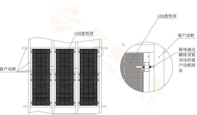 屏體通過(guò)吊鉤與吊梁安裝透明屏箱體之間通過(guò)快鎖或連接片連接,常應(yīng)用于舞臺(tái)櫥窗店鋪等。